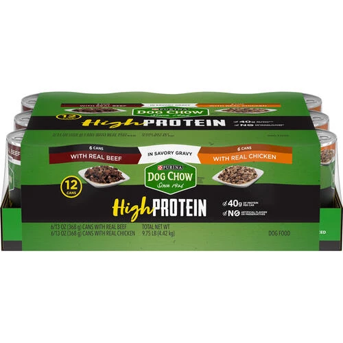 Meaty chunks made with real chicken or beef. Savory gravy. 40 grams of protein per can. Get ready for your furry friend to show his thanks in a big, big way. And with high-quality ingredients, no artificial flavors or preservatives, and100% balanced adult dog nutrition, you can feel great about delighting him with this high protein wet dog food day after day.