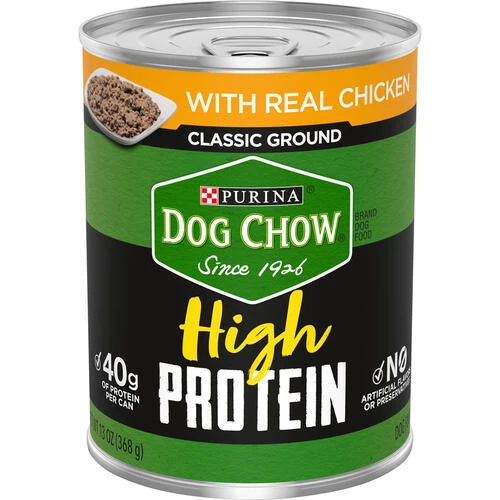 High protein meets high flavor? and real flavor at that! Packed with 40 grams of protein per can and made with real, American-raised chicken, this meaty wet dog food is an exciting way to fuel your dog?s entire day. Best of all, there?s absolutely no artificial flavors or preservatives.