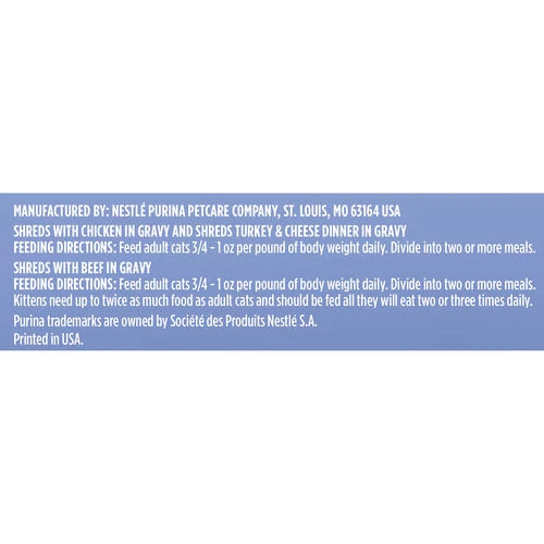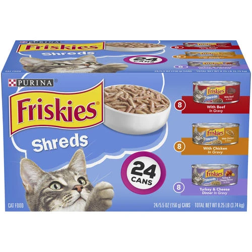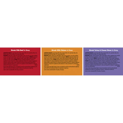 Includes 8 cans of Shreds with Beef in Gravy, 8 cans of Shreds with Chicken in Gravy and 8 cans of Shreds Turkey & Cheese Dinner in Gravy