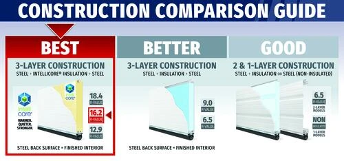 - Best construction with 1-3/4″ Intellicore® Insulation, R-Value 16.2 – Warmer. Quieter. Stronger.