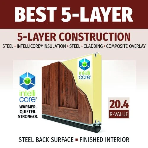Premium Handcrafted garage doors offer the maximum curb appeal with a true handcrafted touch. This Best construction garage door includes 2″ thick Intellicore insulation with R-Value 20.4. Why is Intellicore the Best? Simply said Intellicore is Warmer, Quieter and Stronger. At the heart of an Intellicore door is a continuous layer of polyurethane insulation sandwiched between two layers of steel. The three-layer construction provides strength, dent resistance, insulation and security, as well as quiet operation and a beautiful appearance inside and out.