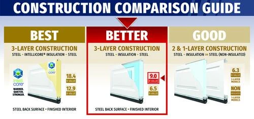 Traditional Steel Panel garage doors feature a design that works with every home without sacrificing style for strength, durability and comfort. This Better construction garage door includes 2″ thick insulation (R-Value 9.0) sandwiched between two steel skins that provides a durable insulating core. The three-layer construction provides strength, dent resistance, insulation and security, as well as quiet operation and a beautiful appearance inside and out.