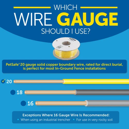 Expand your In-Ground Fence? boundary. Each spool of Extra In-Ground Boundary Wire comes with 500 ft. / 150 meters of 20 gauge, solid core, copper wire rated for direct burial. This covers up to 1/3 acre per spool. The length of wire needed will vary due to amount of twisted wire and the layout you select. A waterproof connection is needed for proper performance when adding additional boundary wire. We recommend using our Splice Kits (RFA-366) which include wire connectors and gel-filled capsules. Trust PetSafe® to help keep your pet healthy, safe and happy.