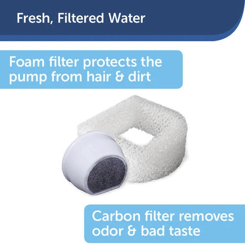 - Filtered Water – The foam filter catches hair and dirt before they reach the pump; the constant water circulation in the bowl helps prevent bacteria growth
