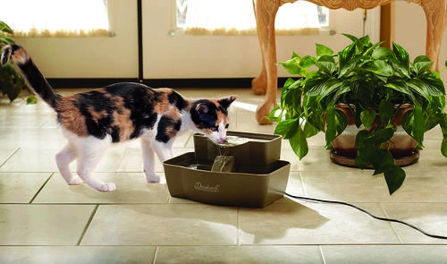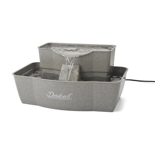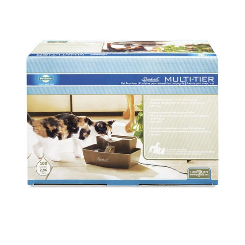 The PetSafe® Drinkwell® Multi-Tier Pet Fountain provides 100 ounces of fresh, filtered water for your pet. A carbon filter removes bad tastes and odors, while the free-falling stream continually aerates the water with oxygen. This fountain features an elevated level and a lower bowl to give your pet two options for staying hydrated.