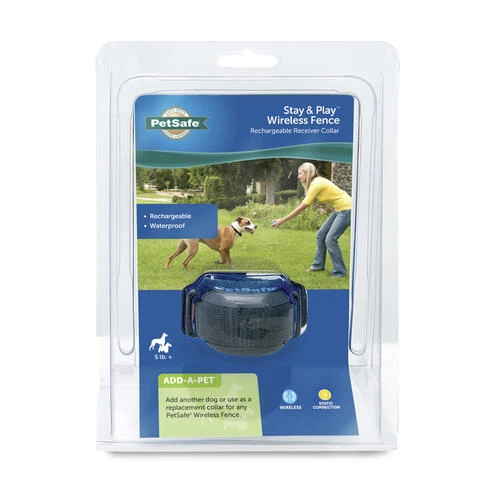 Let outdoor playtime continue with the PetSafe® Stay & Play® Wireless Fence Rechargeable Receiver Dog Collar. This collar is compatible with all PetSafe® wireless fence systems. With five levels of static correction and a tone-only mode, your pet will remain safe and secure in their designated play space. The waterproof design of this collar allows your dog to wear it rain or shine. Use this collar for dogs that weigh five pounds or more and who have a neck size of 6 to 28 inches. The Stay & Play® Wireless Fence collar comes with a built-in rechargeable battery and a low-battery indicator. The collar quickly charges in just two to three hours and lasts up to three weeks depending on frequency of use. The interchangeable design of the collar strap gives you the ability to customize your pet’s collar using any 3/4-inch non-metallic strap. If you have more than one pet, purchase as many additional collars as you need to use with your PetSafe® wireless fence system. PetSafe® brand is here to help you and your pets live happy together™.
