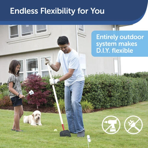 Give your pet the freedom he or she deserves with the PetSafe® YardMax® Cordless In-Ground Fence™. This innovative in-ground containment system features a waterproof transmitter powered by ten D-cell batteries (not included). Perfect for renters, campers, or cabin locations, the YardMax® Cordless Transmitter eliminates the need to drill holes in your home’s exterior. The battery-powered transmitter helps keep your dog or cat safe even during power outages. The rechargeable YardMax® Cordless Receiver Collar works for most cats and dogs weighing five pounds or more and with a neck size measuring 6 to 28 inches. The rechargeable collar lasts up to three months on a single charge and recharges in just two to three hours. With just a few short training sessions, you’ll create a secure boundary for your pets to enjoy the outdoors like never before.