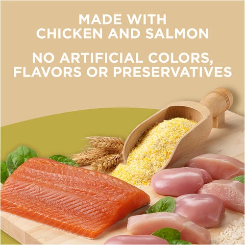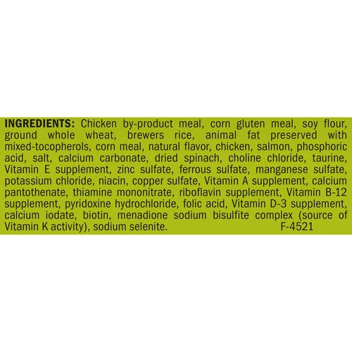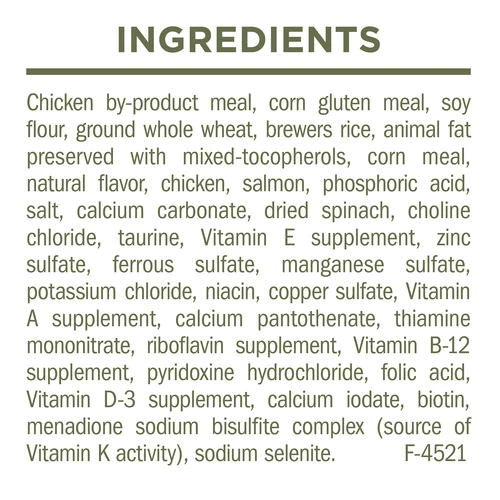 - Ingredients; Chicken By-Product Meal, Corn Gluten Meal, Soy Flour, Ground Whole Wheat, Brewers Rice, Animal Fat Preserved with Mixed-Tocopherols, Corn Meal, Natural Flavor, Chicken, Salmon, Phosphoric Acid, Salt, Calcium Carbonated, Dried Spinach, Choline Chloride, Taurine, Vitamin E Supplement, Zinc Sulfate, Ferrous Sulfate, Manganese Sulfate, Potassium Chloride, Niacin, Copper Sulfate, Vitamin A Supplement, Calcium Pantothenate, Thiamine Mononitrate, Riboflavin Supplement, Vitamin B-12 Supplement, Pyridoxine Hydrochloride, Folic Acid, Vitamin D-3 Supplement, Calcium Iodate, Biotin, Menadione Sodium Bisulfite Complex (Source of Vitamin K Activity), Sodium Selenite. F-4521.