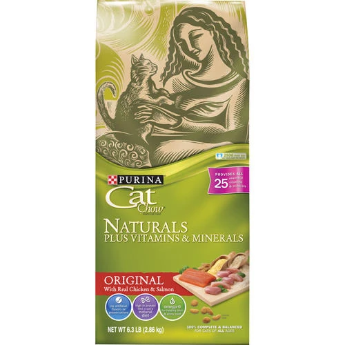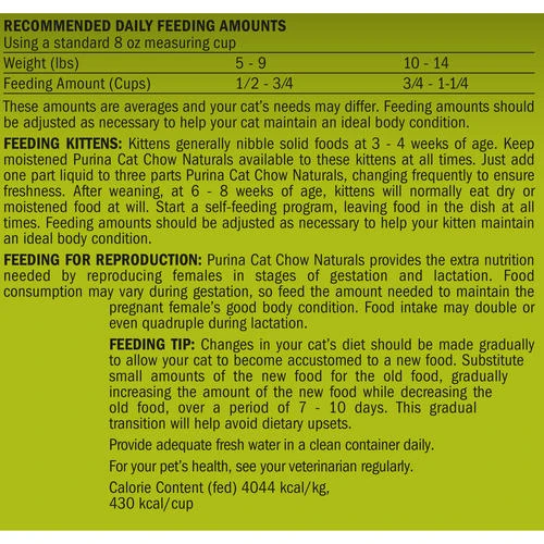 Our top priority is the quality of the food that nourishes not only your pets but our pets too. So, inside every bag of Purina® Cat Chow® you’ll find a selective blend of protein, carbs and fat. From source to bowl, our high standards of testing, tracking and control assure the quality of every premium cat food formula we create. A cat’s natural diet includes high levels of protein — and that’s what inspired this formula. We use whole grains, real chicken and other high-quality protein sources. We also include fiber to help control hairballs, vitamins and minerals and a touch of leafy greens. What didn’t we add? Artificial flavors or preservatives.