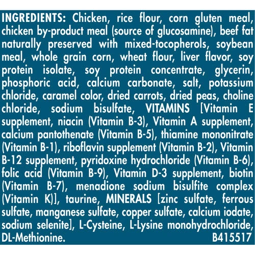 - Ingredients; Chicken, Brewer’s Rice, Corn Gluten Meal, Poultry By-Product Meal, Wheat Flour, Soybean Meal, Animal Fat Preserved with Mixed-Tocopherols, Whole Grain Corn, Animal Liver Flavor, Soy Protein Isolate, Soy Protein Concentrate, Fish Meal, Glycerin, Phosphoric Acid, Calcium Carbonate, Salt, Caramel Color, Potassium Chloride, Sodium Bisulfate, Choline Chloride, L-Cysteine, Taurine Vitamin E Supplement, Zinc Sulfate, L-Lysine Monohydrochloride, DL-Methionine, Ferrous Sulfate, Niacin, Manganese Sulfate, Vitamin A Supplement, Calcium Pantothenate, Thiamine Mononitrate, Copper Sulfate, Riboflavin Supplement, Vitamin B-12 Supplement, Pyridoxine Hydrochloride, Folic Acid, Vitamin D-3 Supplement, Calcium Iodate, Biotin, Menadione Sodium Bisulfite Complex (Source of Vitamin K Activity), Sodium Selenite. A-4155.