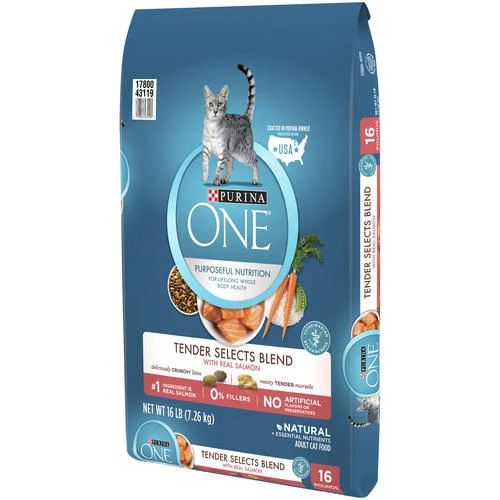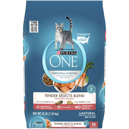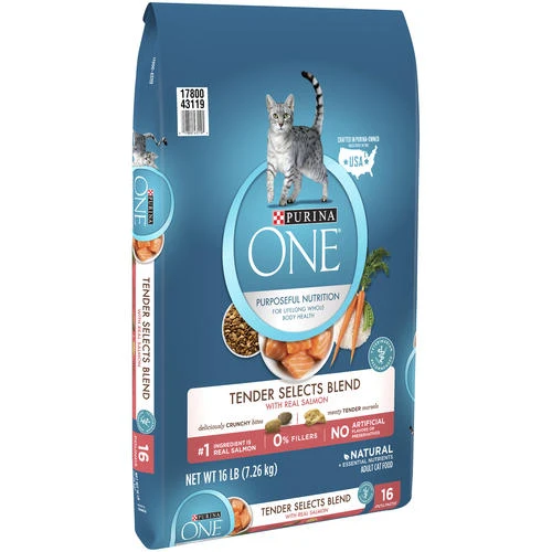 Purina ONE® Tender Selects Blend with Real Chicken is a deliciously meaty blend of protein-rich, crunchy and tender bites that will satisfy your cat and promote lifelong whole body health.