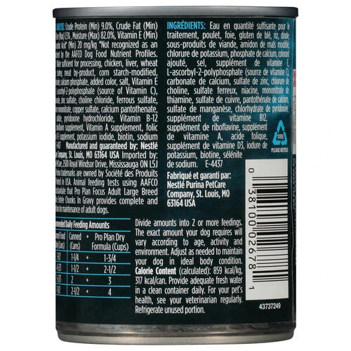 The Purina Pro Plan Focus nutritional platform offers a specialized formula that?s right for your dog. So whatever size, age, or unique need, help your dog be his or her best with a Pro Plan Focus formula that matches those needs. Purina Pro Plan Focus Adult Large Breed Chicken & Rice Entree Chunks in. Gravy provides 100% complete and balanced nutrition for adult dogs weighing 50 lbs or more. It features real chicken and helps support a healthy immune system.